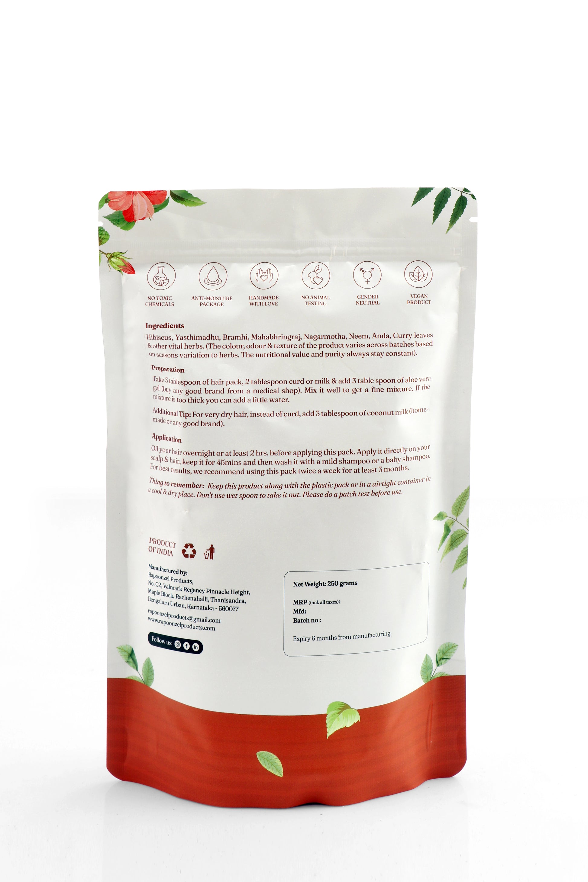 Contains Hibiscus, Bhringaraj, Amla, Curry Leaves, Neem and other vital herbs.