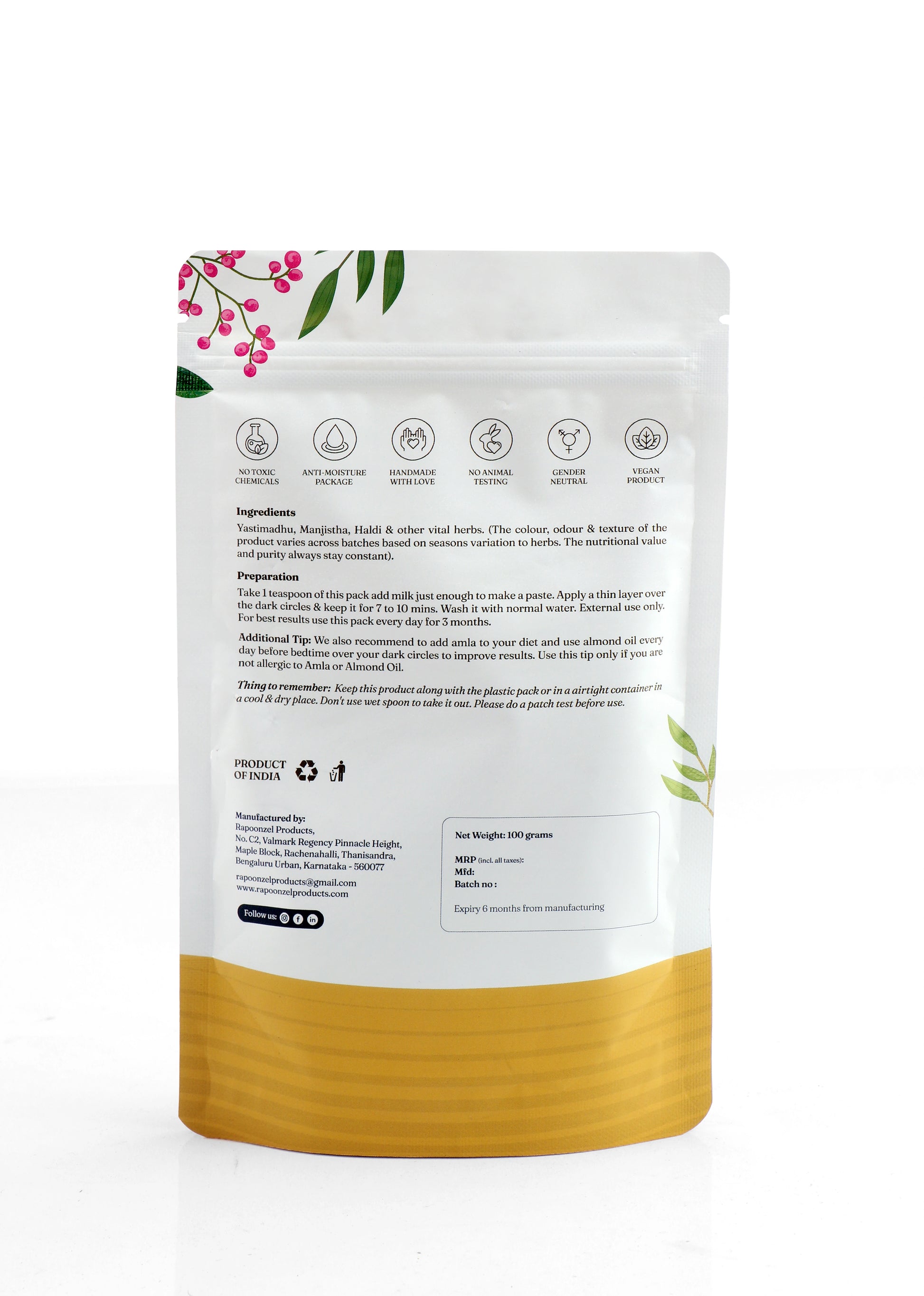 The product contains pure herbs along side Neem & Chandan that help take care of your under eye region magically.